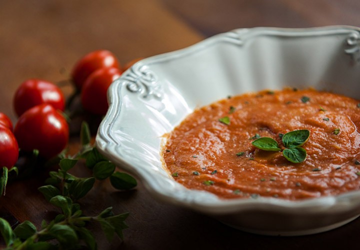 Preheat oven to 200 C. Cut tomatoes in half, season with salt, pepper and nutmeg, add oil and garlic cloves. Put in the oven for 20-25 minutes. Meanwhile boil the potatoes.